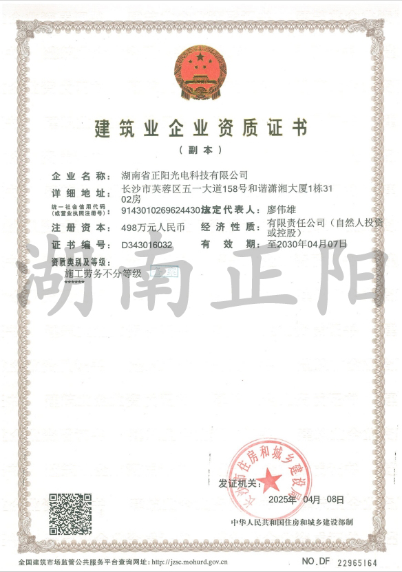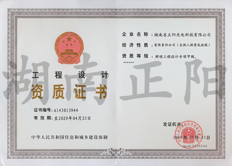 湖南省正陽光電科技有限公司是一家從事亮化工程及大型燈光藝術的設計、制作、安裝和維護于一體的專業(yè)化公司。公司資質齊全、管理嚴謹、技術先進、實力雄厚,取得了城市及道路照明工程專業(yè)承包壹級資質、照明工程設計專項甲級資質、機電工程施工總承包貳級資質、施工勞務等資質,榮獲“重質量·守誠信”示范企業(yè)。